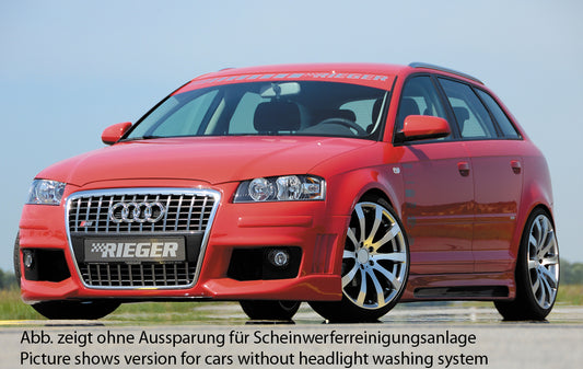 Audi A3 (8P) Rieger Spoilerstoßstange R-Frame mit Halter f. orig. NSW, mit Abdeckkappen f. orig. NSW, mit seitlichen Rippen, ABS, für Fzg. mit Scheinwerferreinigungsanlage, inkl. Alugitter, Montagezubehör, ABE
