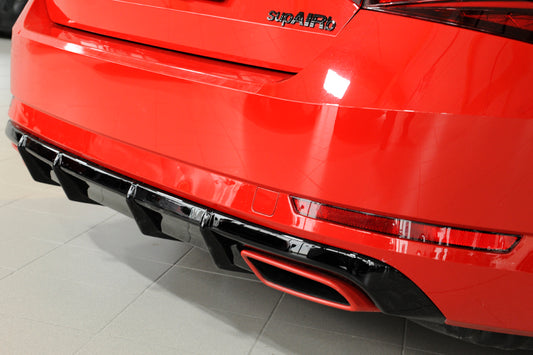 Skoda Superb III (3T/3V) Rieger Heckeinsatz nur 2.0 TSI (200/206kW) für orig. Endrohrblende li. u. re., ABS, schwarz glänzend, für Fzg. mit Einparkhilfe (PDC), inkl. Montagezubehör, Gutachten