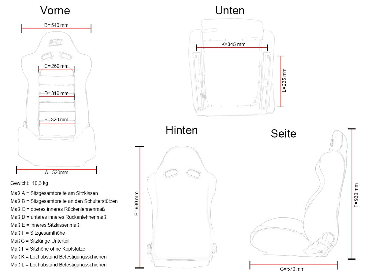 Sportsitze / Halbschalensitze sind ein absoluter Blickfang für jedes sportlich getunte Auto. Die Halbschalen Sportsitze sind aus feinen und robusten Bezugsstoffen und absolut hochwertig von Hand genäht. Die Optik der Sportsitze bzw. Halbschalensitze ist jedoch nur der Nebeneffekt. Die Sitze haben eine sehr gute Seitenführung und dadurch bei einer sportlichen Fahrweise oder auch auf der Rennstrecke bleiben Sie dort wo Sie sein sollen, nämlich auf dem Sitz und nicht mit dem Gesicht auf der Seitenscheibe! Im Ernst, viele Fahrzeuge werden mit aufwendigen Fahrwerks- und Motortuningmaßnahmen getunt und viele vergessen dabei das der Fahrer auch stets im Sitz bleiben sollte. Daher ist die Sitzseitenführung auch eines der wichtigsten Elemente in Sachen Tuning. Diese hochwertige Sportsitzset hat eine hervorragende Seitenführung und zeichnet sich durch die hervorragende Verarbeitung, seinen belastbaren Bezugsmaterial und seinen hervorragenden von Hand genähten Nähten aus. Die Sitze sind ein absoluter Blickfang und haben ein sehr gutes Preis-Leistungsverhältnis. Die Sportsitzsets werden mit Laufschienen ausgeliefert. Das bedeutet Sie müssen noch fahrzeugspezifische Sitzkonsolen hinzubestellen. Beachten Sie dabei das Konsolenmaß, den es gibt verschiedene Ausführungen. Eine andere Möglichkeit ist die das Sie die Serienkonsole umbauen und auf den Sportsitz passend machen. Auch besteht die Möglichkeit eine Universallkonsole zu bestellen, die jedoch dann auf Ihr Fahrzeug angepasst werden muss.GERINGE EINBAUKOSTEN: Die Sportsitz-Sets werden mit einer Laufschiene (Vor- und Zurückverstellmöglichkeit) ausgeliefert. Diese wird gratis wenn nicht anders angegeben mit geliefert. Sie müssen sich jedoch noch eine passende Fahrzeug-Sitzkonsole für diesen Sportsitz mit dem entsprechenden Konsolenmass, siehe in der Kurzbeschreibung organisieren. Mit einer passenden Sitzkonsole sind die Sportsitze in ca. 2 Std. montiert und im Fahrzeug verbaut.Einbauanleitung: Eine Einbauanleitung ist aktuell in Vorbereitung. Als erstes müssen Sie die fahrzeugspezifische Sitzkonsole montieren. Darauf wird dann der Sportsitz mit der Laufschiene montiert!Die Qualität der Sportsitze: Die Sitzqualität ist sehr hoch. Auch die Bezugsstoffe auf der Sitzfläche sowie auch an der seitlichen Sitzverkleidung und auch Rückseite ist sehr hoch. Das Material ist ein sogenanntes "A-Sitzbezugsstoff". Das bedeutet das der Sitzbezugsstoff sehr reibungsresistent und Widerstandsfähig ist. Zudem sind die Sportsitzset in Erstausrüsterqualität hergestellt und werden von namhaften Produzenten für das Zubehörgeschäft produziert.Der Preis: Die Sportsitzsets haben ein sehr gutes Preis-Leistungsverhältnis und sind absolut zu empfehlen. Der Preis ist als Set deutlich günstiger bevor Sie diese einzeln erwerben. Insbesondere da die Laufschienen schon bei den Sitzen kostenlos mitgeliefert werden.Die Technik und Aufbau der Sportsitze: Die Sportsitze bestehen aus einem geschweißten Stahlrahmen der dann mit Schaumstoff verleidet und anschließend mit dem Bezugsstoff ausgestattet wird.Der Klappmechanismus von den Sportsitz: Jeder Sitz ist neigungsverstellbar. Das bedeutet das die Sitzfläche von der Rückfläche in der Neigung einstellbar ist. Im Regelfall ist der Sitz auch klappbar und kann daher auch bei 3-türigen Fahrzeugen verbaut werden. Es kann aber auch eine klappbare Sitzkonsole eingebaut werden.Der Unterschied Vollschalensitz zu Halbschalensitz: Ein Vollschalensitz hat ein Maximum an Kurvenstabilität für den Fahrer. Jedoch ist der Sitz nicht von dem Neigungswinkel her einstellbar. Der Sitz wird nur klappbar wenn Sie eine entsprechende klappbare Konsole verwenden. Ein Vollschalensitz wird meistens für Renn- und Slalomfahrzeuge verwendet. Ein Halbschalensitz hat eine nicht so gute Seitenführung wie ein Vollschalensitz jedoch ist er viel komfortabler! Ein Halbschalensitz ist zwischen einem Seriensitz und einem Vollschalensitz in der Mitte in Sachen Sitzkomfort und Seitenführung einzuordnen.Weitere Ausführungsdetails: Die Sportsitz-Sets werden komplett mit Laufschiene ausgelieferthervorragende Seitenführung durch GitterrahmentechnikSportsitz Lehne stufenlos in der Neigung verstellbarGewichtsoptimiert mit Gewicht je Sitz ca.15KgLanglebige und qualitativ hochwertige BezugsstoffeEintragbar über eine Fahrzeugsonderabnahme ( mit Eintragungsstelle wie TÜV/GTÜ/DEKRA ) vor dem Einbau abklärenSitz ist ausgestattet mit Klappmechanismus um die Sitzrückenlehne nach vorne zu klappeninklusive Laufschiene ( Ersparnis von weiteren ca. 30)tolles sportliches Designhandvernähte Sichtnaht für schöne Optiktolle Verarbeitung aus hochwertigen Sitzmaterialien Lieferumfang:1 Sportsitzset Halbschalensitz bestehenden aus einem rechten und linken Sportsitz sowie Laufschiene! Die Sitzkonsole kann auch von anderen Marken verwendet werden und ist nicht im Lieferumfang integriert.